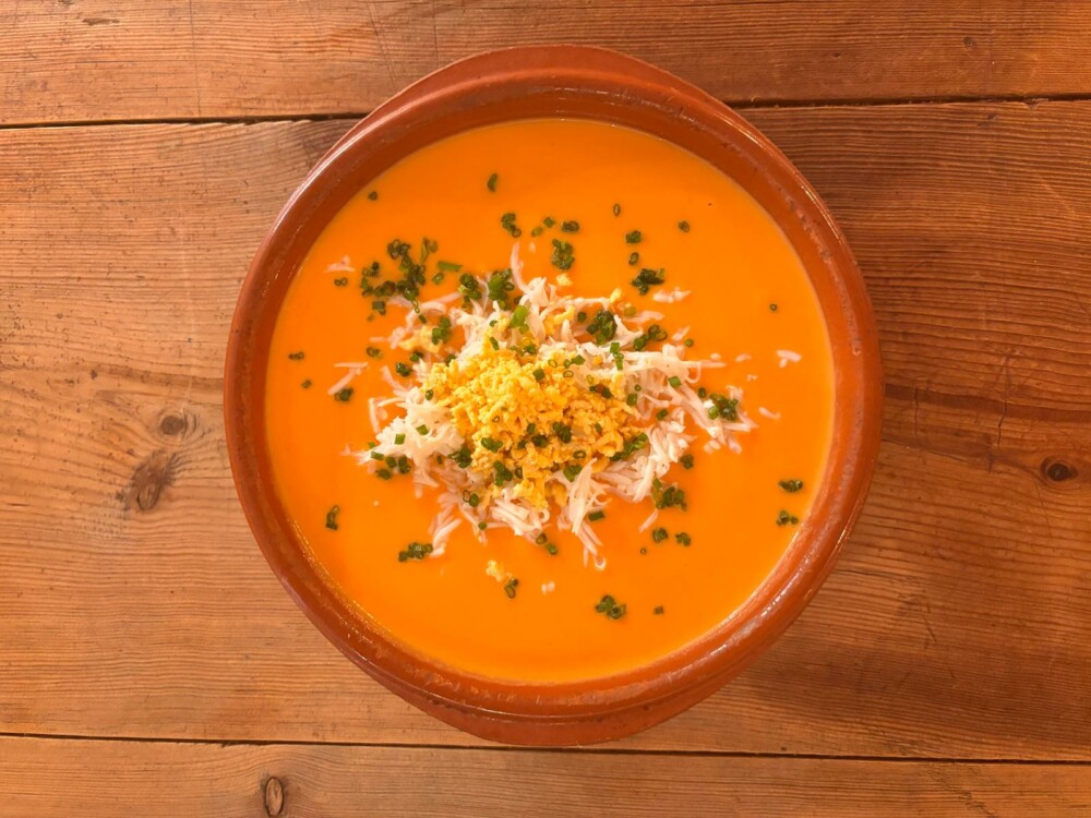 Crema de calabaza con buñuelos de cigala y huevo poché